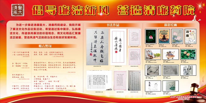 为进一步推进清廉医大、清廉药院建设,结合学校廉洁文化宣传教育月活动,近期,药学院党委开展了形式多样的廉洁教育主题活动,通过集体谈话、廉洁承诺上墙、组织廉洁主题党日活动、制作微视频和主题板报、开展警示教育等,多渠道深化廉洁教育。