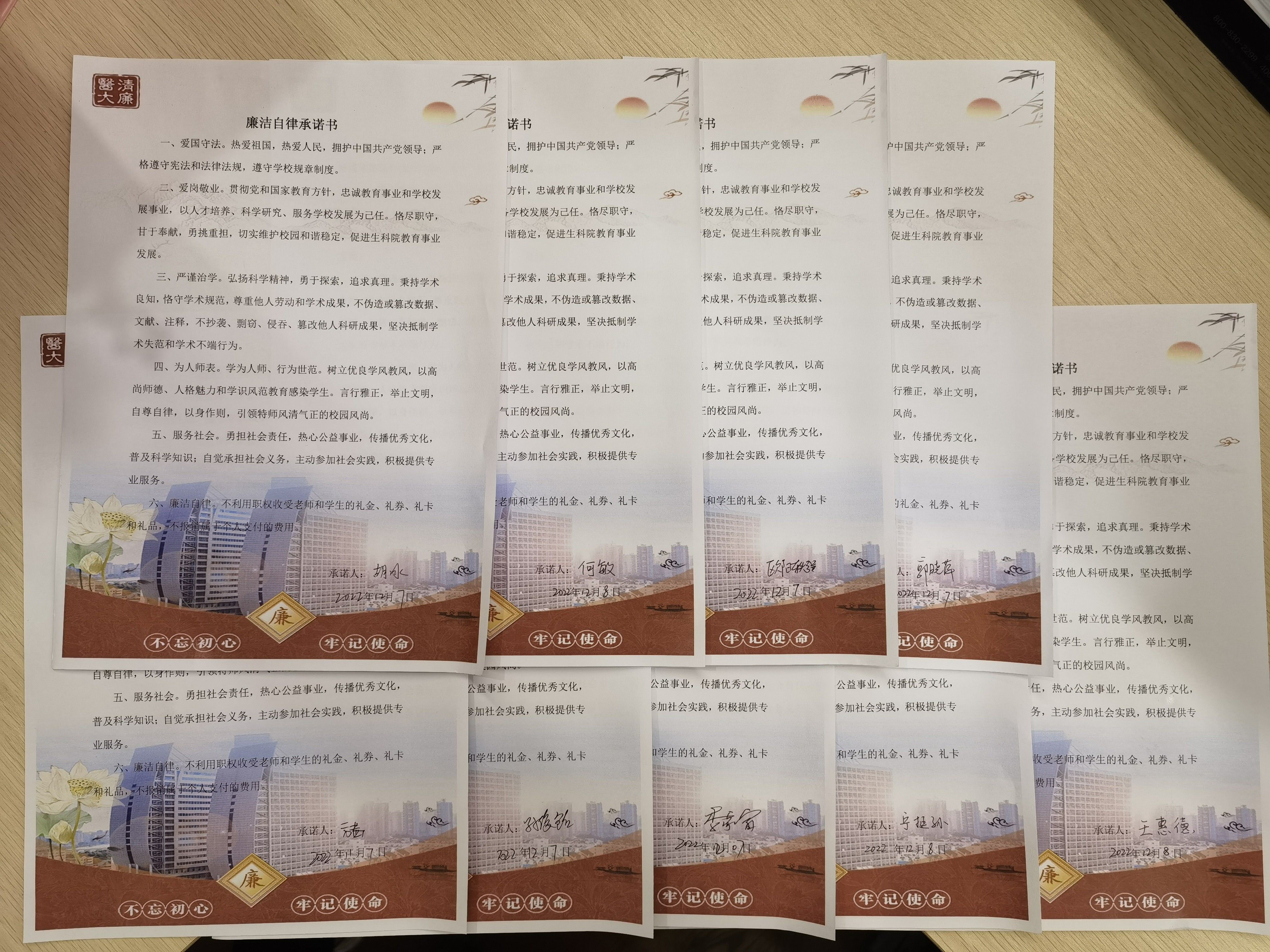 一是认真开展廉洁文化建设。在领导干部中开展以“做好四个表率,永葆清廉本色”为主题的实践活动,使领导干部带头做理论武装的表率、带头做廉洁自律的表率、带头做从严治党的表率、带头做改进作风的表率。在教师职工中开展以“自觉廉洁从教,涵养育人清风”的主题实践活动,引导教师员工严格从教标准,规范自身言行。在学生中开展围绕“以“廉”润心,学风清新”主题弘扬传播廉洁文化活动,培养学生崇尚廉洁人物、遵从廉洁行为。二是开展廉洁承诺。为引导职工廉洁从业,教师廉洁从教,生科院党委与生科院管辖范围内共180多名教职员工签订“廉洁自律承诺书”,通过签订承诺书,能更好地规范和维护教师清廉形象,保持清廉作风,忠诚于党的教育事业及引导教师规范自身言行。三是积极参与学校廉洁文化宣传活动。组织研究生党支部和本科生党支部学生约70余人,到图书馆二楼大厅参观“弘扬中华传统美德,传承良好家风家训”展览,通过借此以飨读者,以启思考,让同学们感受家风家训的深厚底蕴和文化魅力,让好家风、好家训成为弘扬中国优秀传统文化的大众载体。为推动清廉医大,清廉家庭建设走深走实,生科院党委梁浩副书记作为劳模代表参加“大手拉小手,红色家风代代传”红色课本剧展演活动,进一步引导广大家庭、青少年儿童和党员干部汲取红色文化精神,推动形成重视红色家风、加强清廉家风建设的文明风尚。