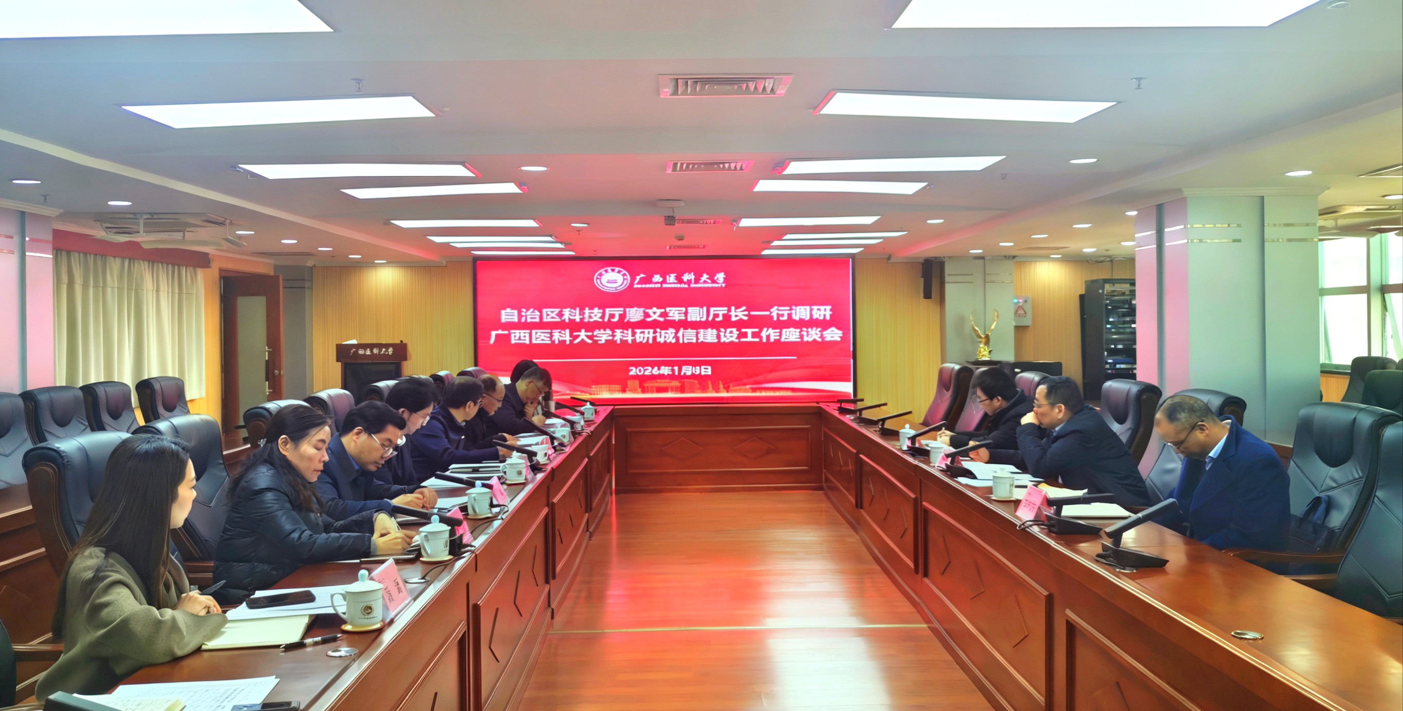 1月8日上午,自治区科技厅副厅长廖文军、监督评估与科研诚信处处长李时群、基础研究与创新平台处副处长唐炳汉一行到我校开展科研诚信建设专题调研并召开座谈会。我校副校长李浪出席会议并作汇报,各附属医院相关负责人参加调研座谈,科技处处长郭宏伟主持座谈会。